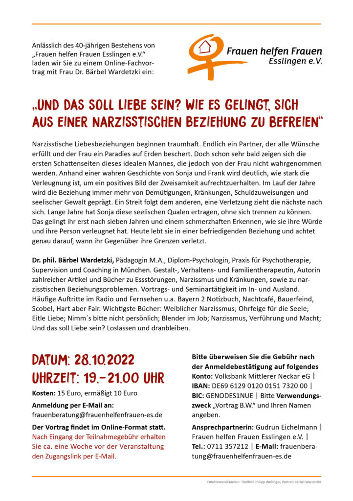 Anlässlich des 40 jährigen Bestehens von „Frauen helfen Frauen Esslingen e.V.“ laden wir Sie zu einem Online-Fachvortrag mit Frau Dr. Bärbel Wardetzki ein.